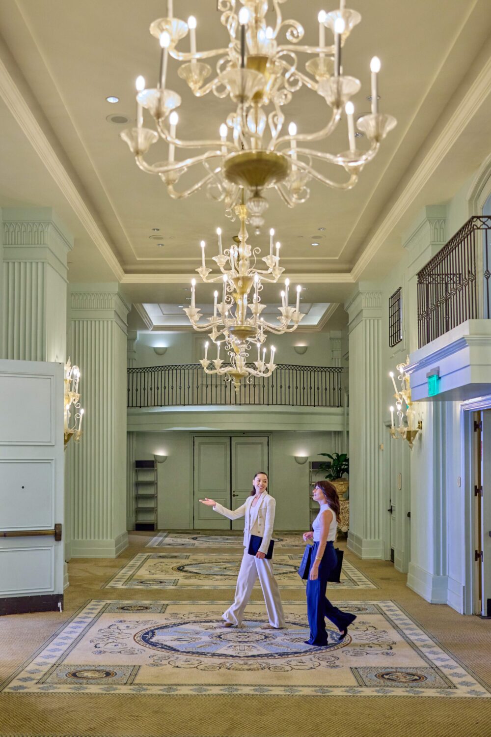 Colonnade Foyer event space with teal walls and beautiful, crystal chandeliers